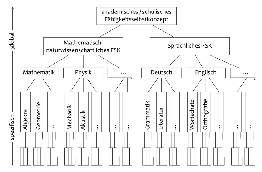Interessant ist, dass beim schulischen Selbstkonzept zwischen dem mathematisch-naturwissenschaftlichen und dem sprachlich dominierten Selbstkonzept unterschieden wird. Dabei geht es um deine eigene Einschätzung und Bewertung, was deine Fähigkeiten und Begabungen im schulischen Kontext betrifft. Wichtig zu wissen ist, dass die Vorstellungen über die eigenen Fähigkeiten nicht immer ganz realistisch sein müssen. Sie können auch über- oder unterschätzt werden. Das Modell von Stiensmeiser-Pelster & Schöne (2008) zeigt die beiden Bereiche: